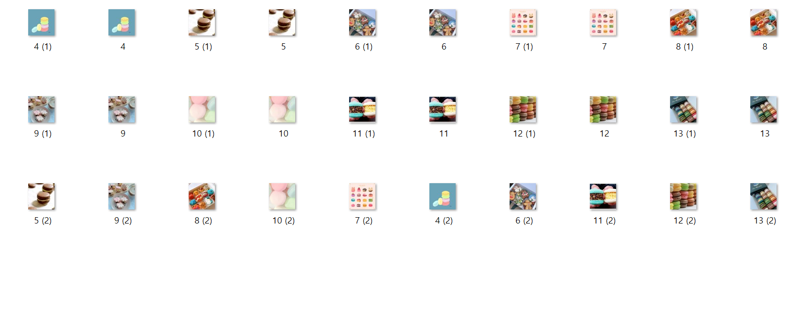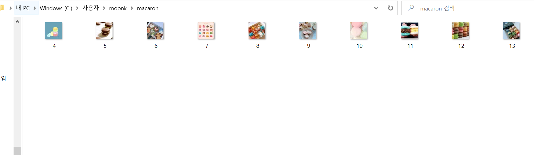 #unlink는 파일을 지워주는 함수입니다 #폴더의 주소를 입력하면 지워지는 형태이니 for 문을 통해 반복적으로 넣어주었어요 from os import unlink for i in photo_list: delete_file = 'C:/Users/moonk/macaron/' + i unlink(delete_file)그 결과