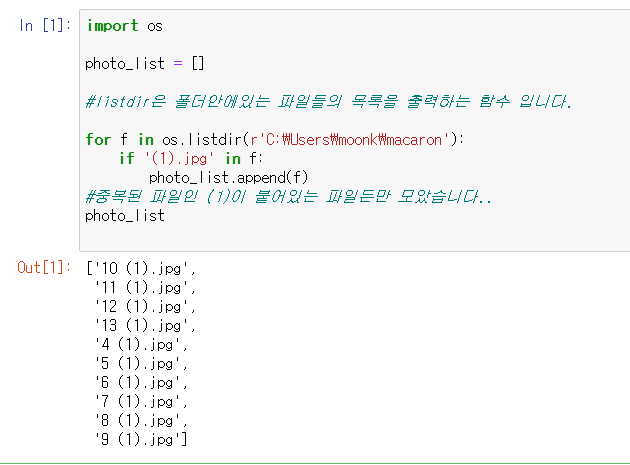import os photo_list = [] #listdir은 폴더안에있는 파일들의 목록을 출력하는 함수 입니다. for f in os.listdir('C:/Users/문갱필/Desktop/파이썬/밀푀유'): if '(1).jpg' in f: photo_list.append(f) #중복된 파일인 (1)이 붙어있는 파일든만 모은거에요 photo_listphoto_list를 출력해주게 되면